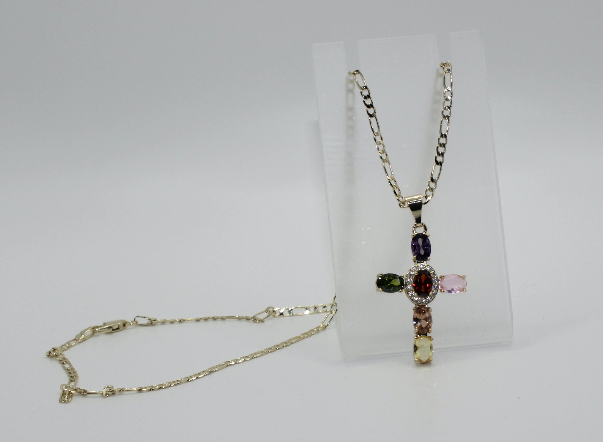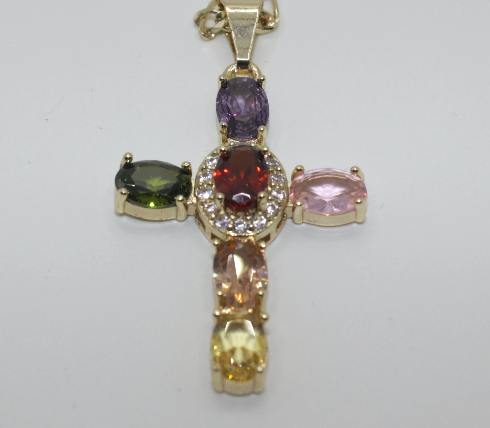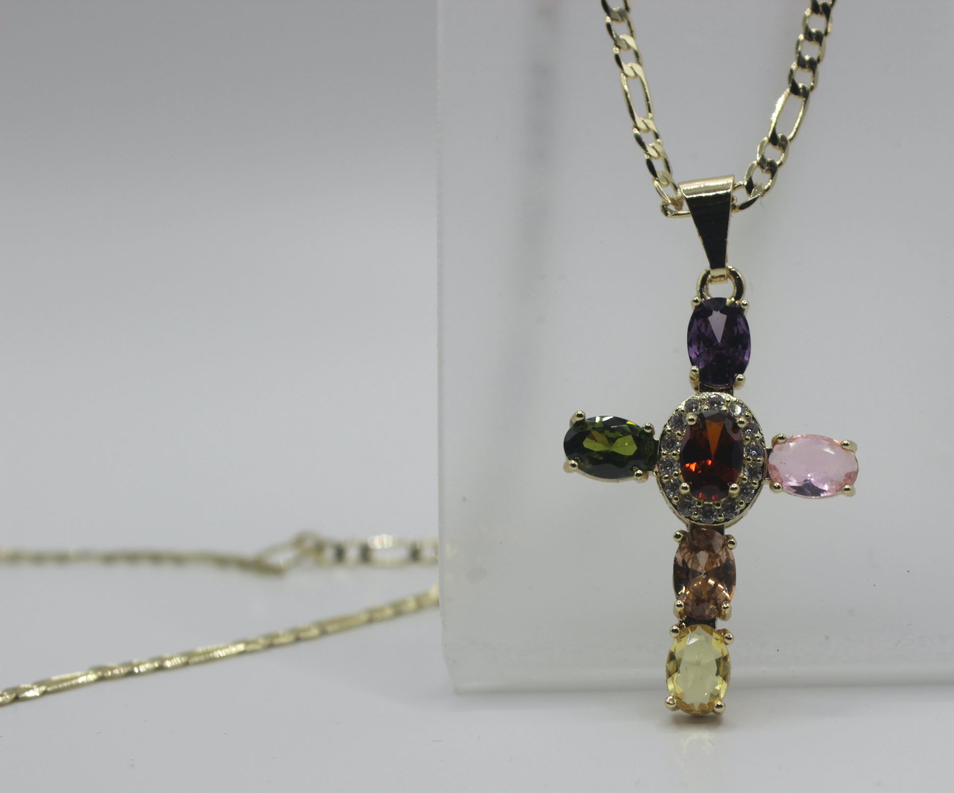A stunning cross necklace featuring six vibrant colors, paired with a sleek gold chain.