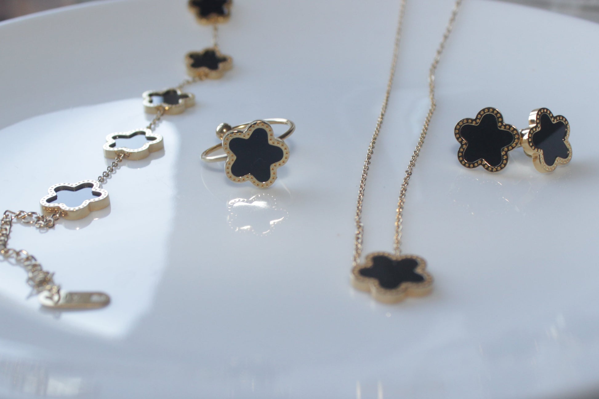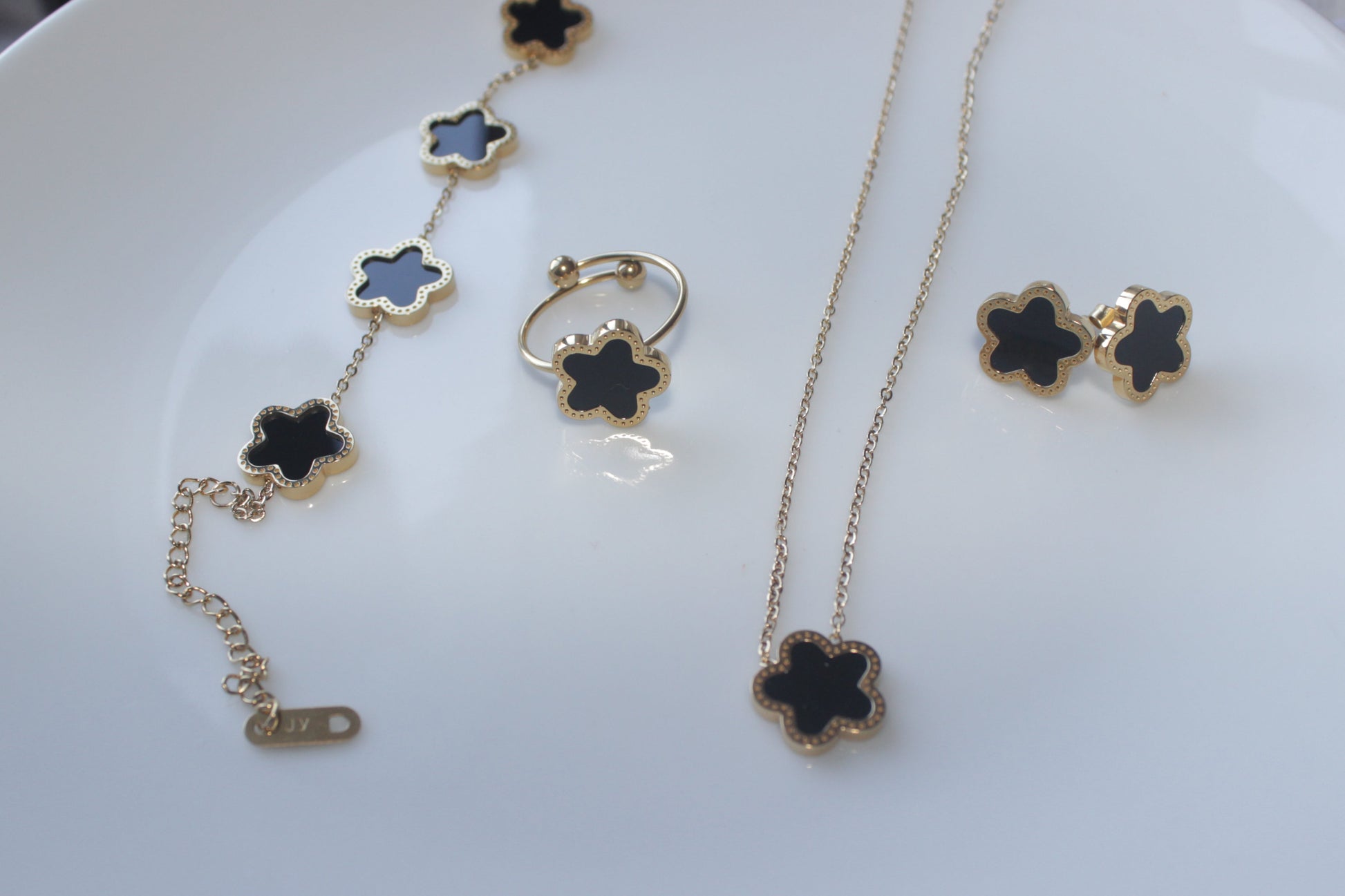 This Gold Plated Jewelry Set combines floral and geometric designs in a minimalist style. Made from durable titanium steel, it offers a modern and elegant look.
