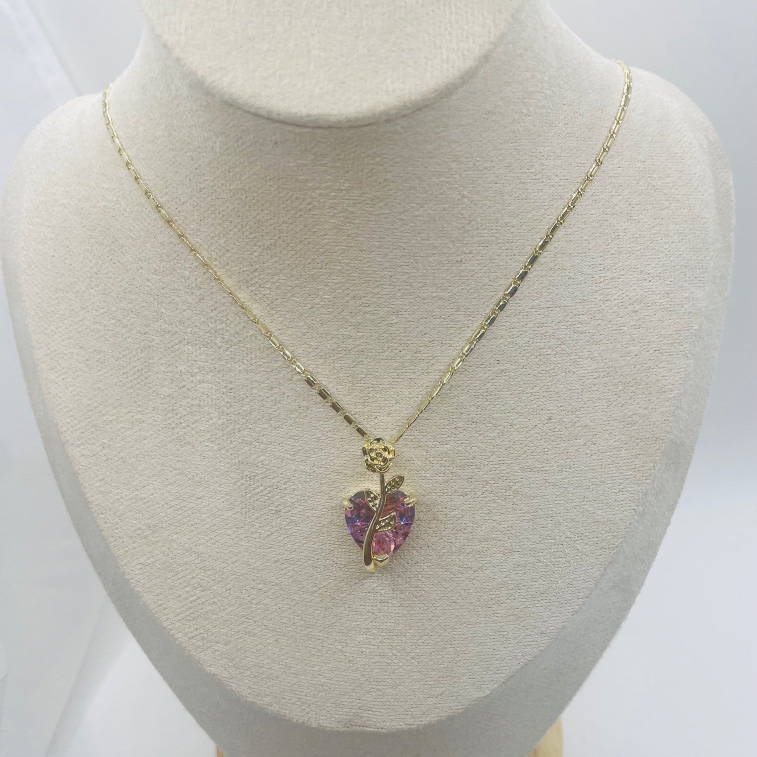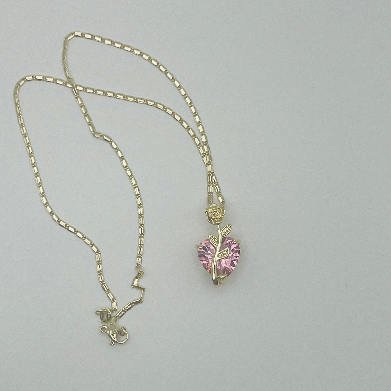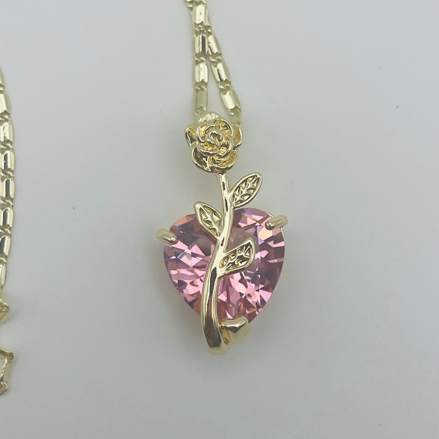 A heart-shaped pendant featuring a blooming rose with pleated gold accents, representing love and timeless beauty.